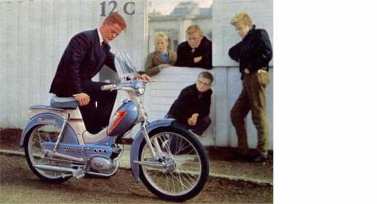 Hur som helst jag var snart femton och tillhörde en stor målgrupp som fick tycka till. Moppen som togs fram kom som 1959 års modell och såg inte så pjåkig ut, men det var nog inte min förtjänst. Men jag var i alla fall en stolt jurymedlem. På reklambilden poserar motorcrossvärldsmästaren Bill Nilsson inför några storögda grabbar som snart skulle fylla femton.