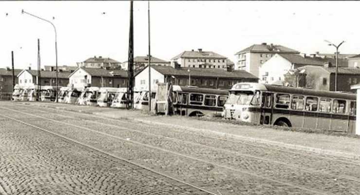 ... och visar i förgrunden min snälla lillebror Kjell som ofta följde med mig och välvilligt poserade på mina bilder. I bakgrunden syns några helt nya bussar som ännu ej tagits i trafik, även några äldre bussar och reservbussar syns parkerade.