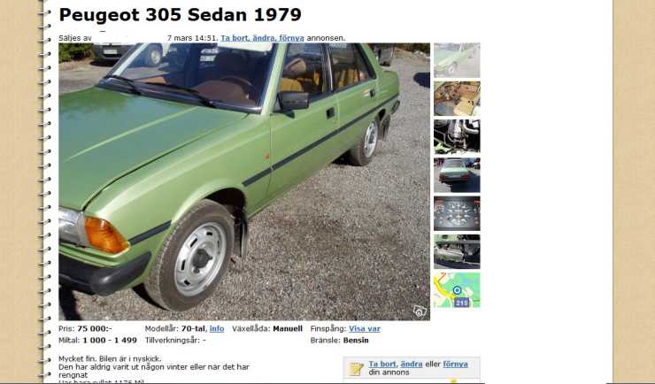 Annonsen information är knapphändig, men i Finspång står denna Peugeot 305 från 1979. Med 1 176 mil på mätaren är den knappt inkörd. Utrustningen är sparsmakad, plåtfälgar ser redigt ut men metallickulören är en extravagans.