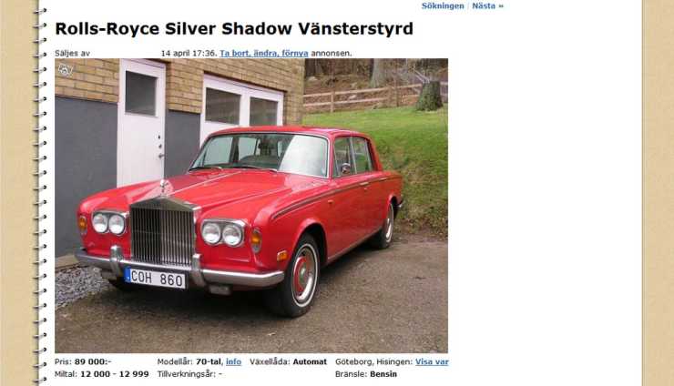 Bilen är vänsterstyrd och man misstänker ett förflutet i Hollywood eller Las Vegas, platser där inga ögonbryn skulle lyftas för en röd RR. I Sverige har bilen funnits sedan 1986 och säljaren begär 89 000 kr – ett belopp som ligger inom det normala prisspannet för Silver Shadow som är den mest tillverkade av alla Rolls-Royce-modeller.