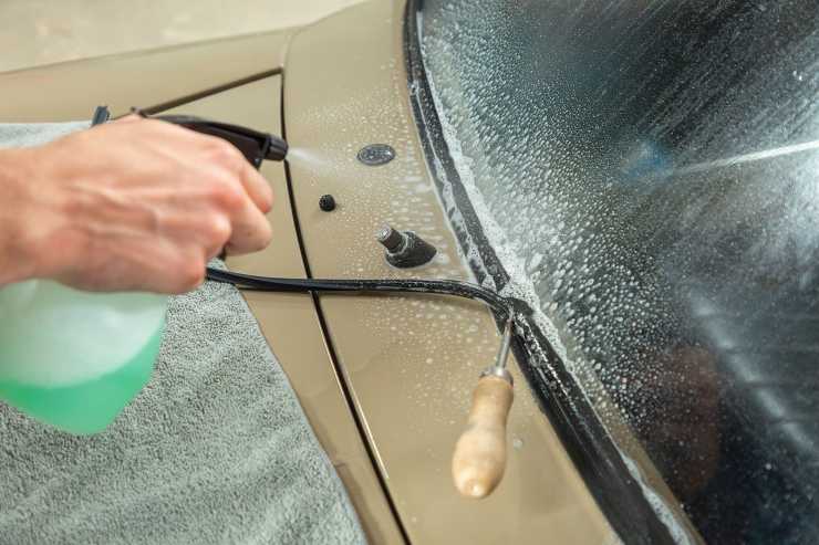3. Någon form av smörjmedel är ett måste vid montering men underlättar även när rutan ska bort. Det finns speciellt framtagna glidmedel. Diskmedel fungerar lika bra men blir snabbt rinnigt. Vi sprejar på rikligt.