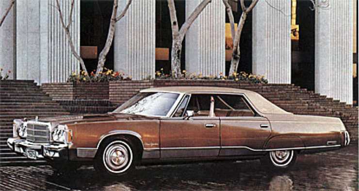 Fortfarande 1975 var New Yorker en fullsize-bil och mitt i bränslekrisen var detta inte särskilt bra. Till höger har vi "the splendid New Yorker Brougham 4-Door Hardtop with vinyl roof".
