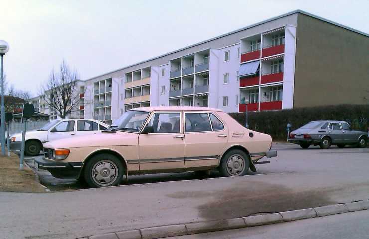 Nästa bild på en snygg hyreshusmiljö togs i april av den lika flitige bilspanaren Marcus i Ljusdal. Här har jag inte kunnat tyda registreringsskyltarna så jag vet inte exakta årsmodeller - men åttiotalare är det! På samma parkering står en Saab 900 (sannolikt från 1986), en Saab 99 (1983-84) och en Opel Kadett (1984-88). Tittar man inte så noga så ser man inte att jag retuscherat bort en Renault Kangoo bredvid Kadetten.