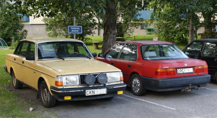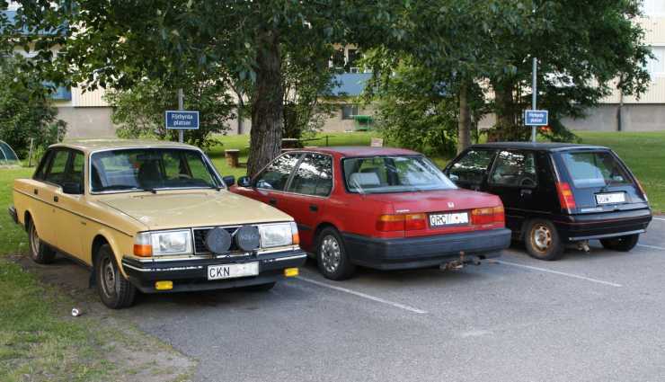 I Umeå förra sommaren knäppte jag nästa bild. Här har en snyggt gul Volvo 244 från 1982, en Honda Accord från 1990 (liksom Mazdan ovan presenterad 1989 som 1990 års modell) och en Renault 5 från 1990 hamnat bredvid varandra. Renaulten och Hondan är avställda sedan ett par år, men Volvon, med endast tre ägare på nacken, är besiktigad och i trafik.
