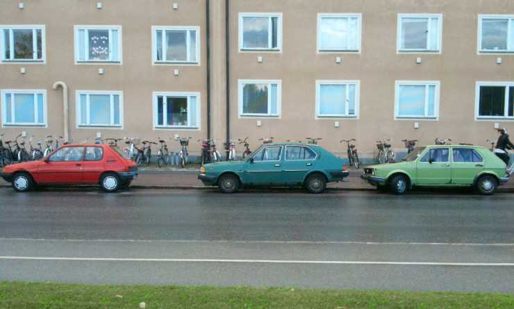 Nästa bild knäppte jag själv idag med mobilen på väg hem från jobbet. Här står en Peugeot 205 från 1989, en Volvo 345 från 1983 och en Volkswagen Golf från 1980 på rad. Precis när jag tagit bilden susade en BMW 5-serie med E28-karossen förbi. Med kjolpaket! Vilken bild det hade blivit!