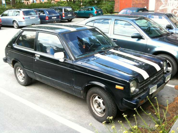 Den första Starleten jag fotograferat är från 1979, alltså första årsmodellen för denna generation. Starlet hade beprövad teknik såsom stel bakaxel, bakhjulsdrift och stötstångsmotor på 1,2 liter. Jag gissar att just den här bilen inte var svart från början. Säkert är i alla fall att den inte hade vita ränder som ny.