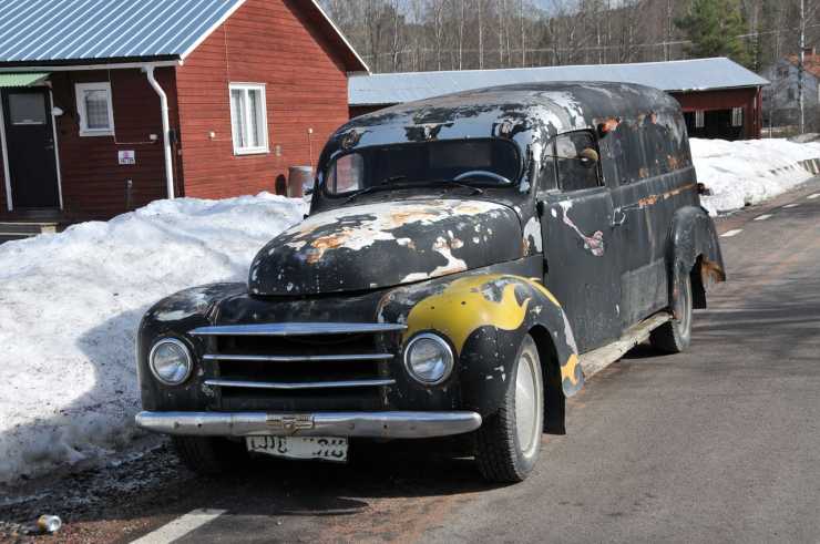 Kanske gick den ut som begravningsbil men den kan lika gärna ha varit ambulans eller skåpbil. På sin ålders höst verkar den har råkat ut för ägare med custombyggarambitioner. Den har försetts medmoulded bullet tail-lights och regplåten bak är tunneled.