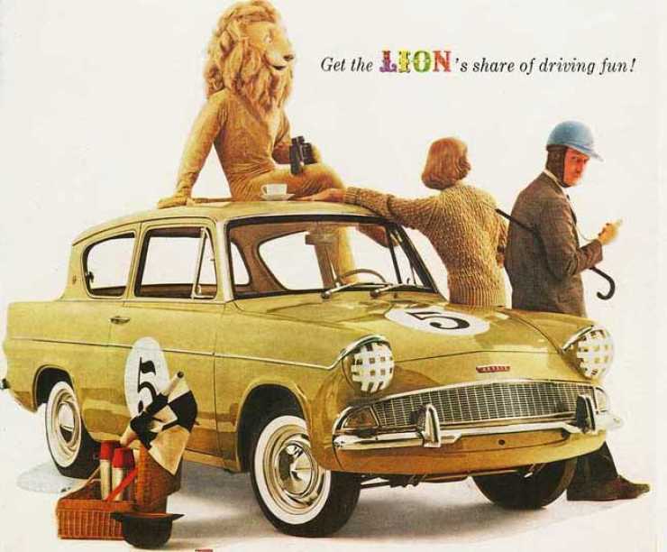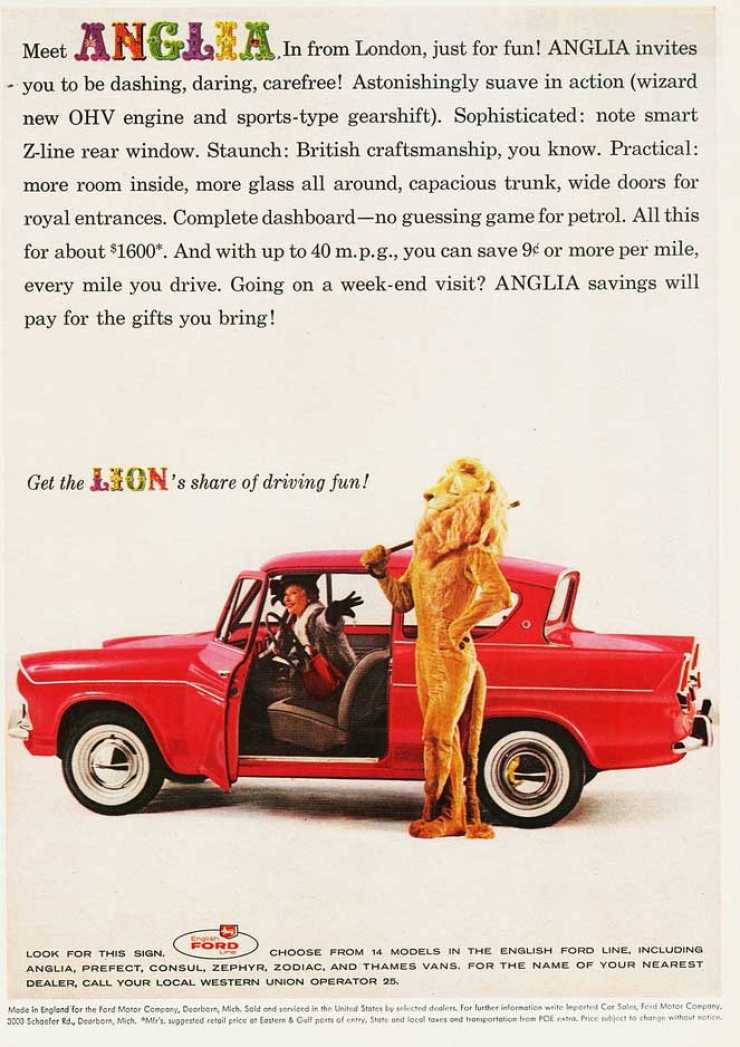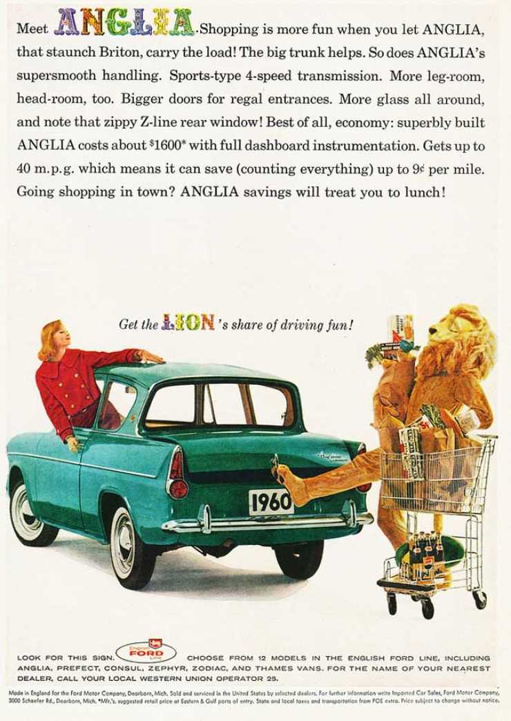 Anglia 105E som modellen från 1959-67 med snedrutan heter har ändå en viss USA-anknytning, då den inåtlutade bakrutan även återfannsn på Lincoln och Mercurys modeller. Hur framgångsrika dessa var på de stora bilarnas marknad är obekant, men dom var inte ett helt ovanligt inslag i gatubilden.