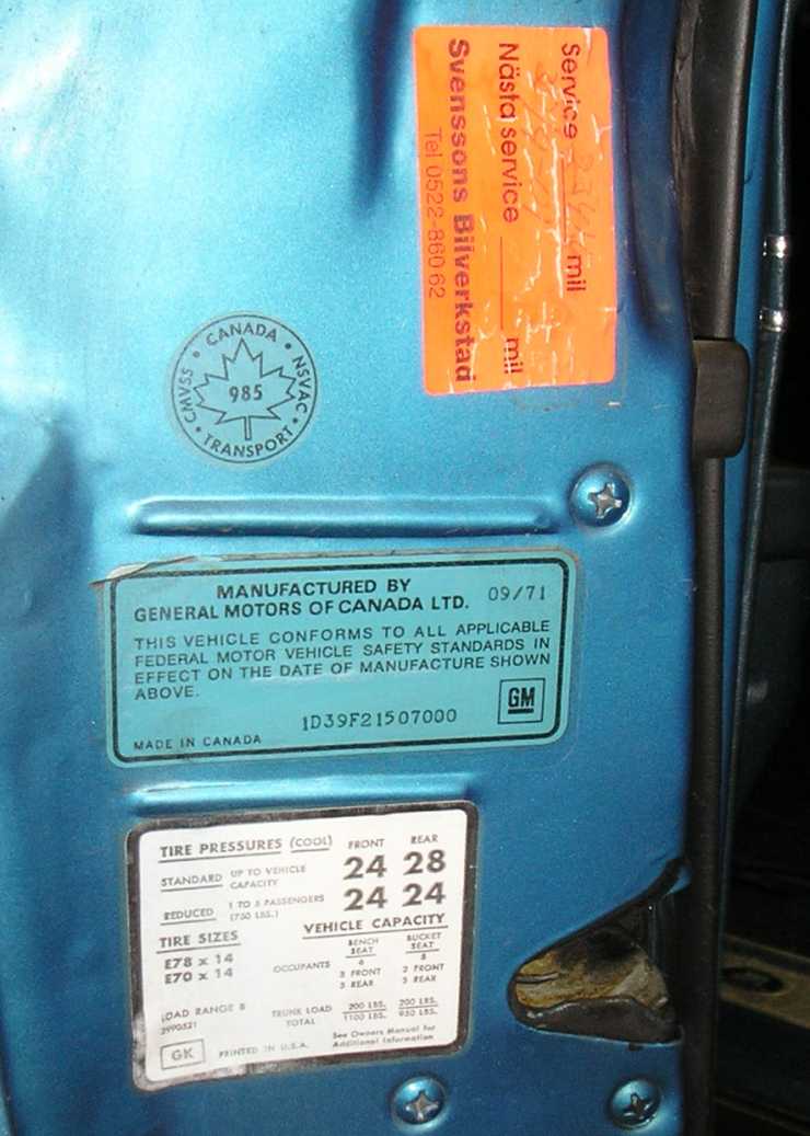 vid servicen 2001 visar lappen att bilen hade rullat 2341 mil, manufacturer plate skvallrar om att den är byggd i kanada september 1971.