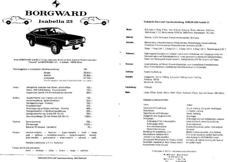 Här står det att 'Borgward Isabella 23' görs på AMC Concord (som kom 1978) men skall ha Borgwards 2,3 liters sexa.
