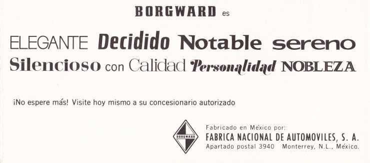 Men det tog lite tid för Ramirez huvudbolag Industria Automotriz gick i konkurs 1964. Först 1967 under det nybildade FANASA kom den mexikanska Borgwarden ut och den bytte nu namn till Borgward 230GL
