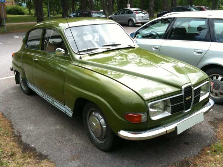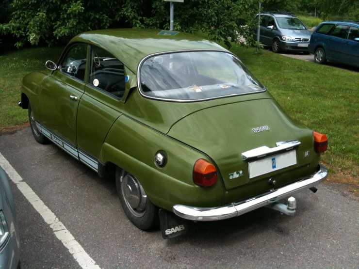 Dagens bil är en veronagrön Saab 96 från 1974 som i våras stod på en parkering utanför mitt jobb. Den såg ut att vara i ett mycket fint orört skick och kan kanske ha rullat så lite som de 6300 mil som Transportstyrelsen anger. Annars får vi lägga till 10000 mil, men det blir ju inte så mycket ändå. Någon har i alla fall någon gång beslutat sig för att få denna bil att se ut som den är snabbare än den i själva verket är. Nu vet jag ju inte vad som finns under huven, men jag gissar att det är originalutförande där då bilen i övrigt är så pass omodifierad på utsidan.