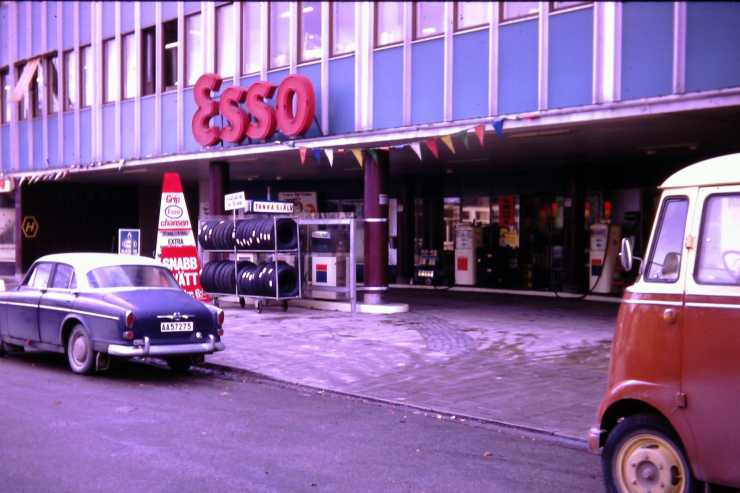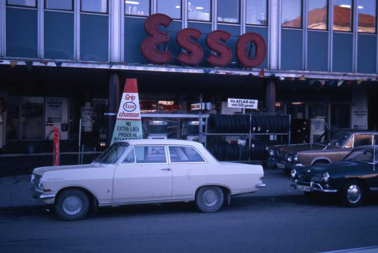 På en annan bild från samma mack som vi hittat i arkivet står en tyskregistrerad VW Karmann-Ghia cabriolet, en guldglänsande Valiant och en mer alldaglig Opel Rekord A.