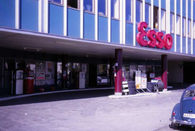 Här ser vi någonting som aldrig mer kommer att byggas, en bensinstation under ett stort kontorshus. Den enda kvarvarande jag känner till är Statoilmacken på Birger Jarlsgatan i Stockholm. Den här bilden föreställer dock inte den – detta är Södra Långgatan 23 i Solna och huset är numera ersatt av ett annat.