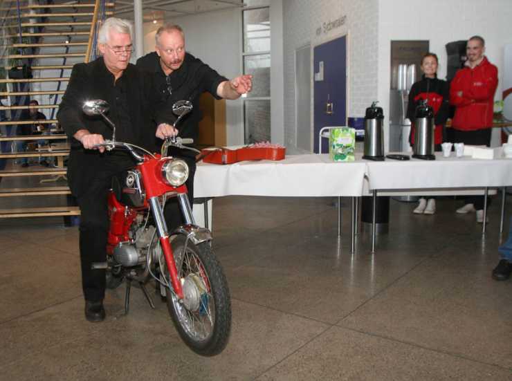 Kör rakt fram! Invigaren och mopednostalgikern, chefen för Dalarnas museum Jan Raihle, fick i stället för den vanliga saxen grensla en moped och köra av bandet. Göran Eriksson från Sveriges Vägmuseum visar vägen.