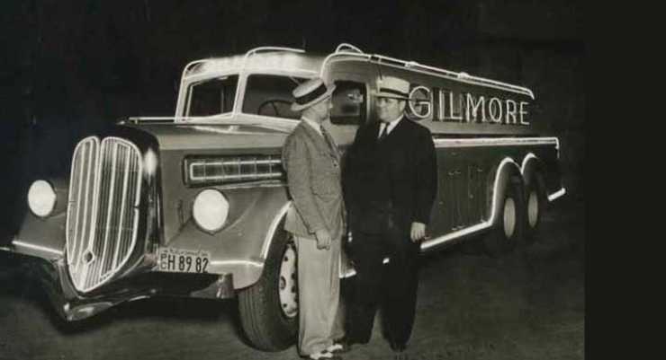 Neonskyltar började bli populära under 20-talet, men första exemplet på att klä ett fordon med dylikt torde vara den här Mack BM tankern som tillhörde Gilmore Oil company, som syntes lysa upp trafiken 1934.