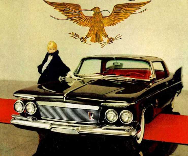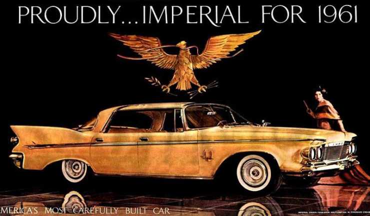 1961, då fenmodet var på väg ut så presenterade Imperial de vildaste fenorna någonsin, med baklysena hängades under. Likaså stod framlyktorna fritt på kofångaren fram med framskärmarna framdragna över dom. Trycknappsautomat, superelliptisk ratt, elektroluminicent instrumentbelysning och mer fri kreativitet återspeglades inuti vagnen. Märkligt nog gick man tillbaks till att bygga med separat ram detta år istället för en självbärande kaross. Det här var Virgil exners sista skapelser för Chrysler, och återigen samarbetade man med modebranschen för att vackert lansera den nya Imperialen, americas most carefully built car.