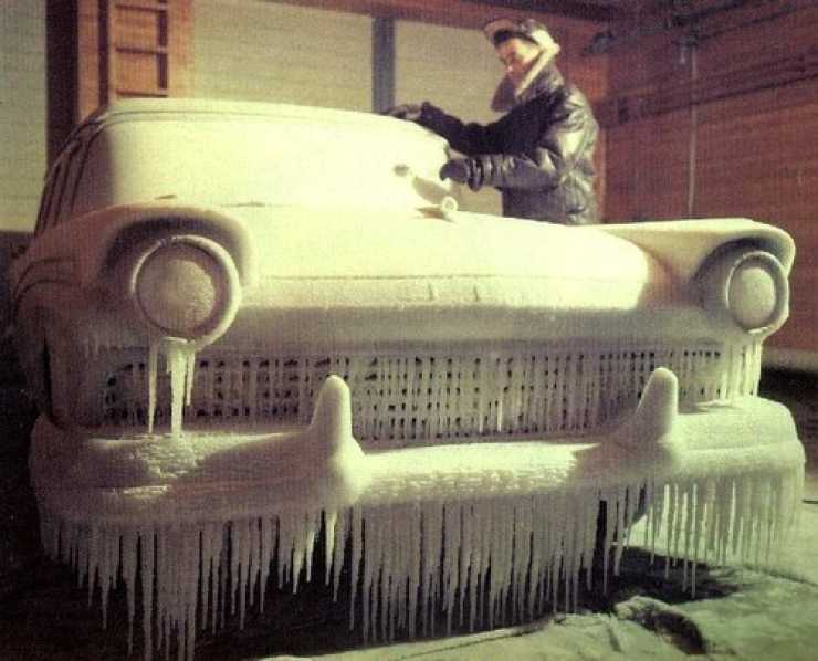 Han håller på att köldtesta den nya Ford Fairlane av kommande års modell. Pallar den av -50C? Jodå, det skall nog inte vara några problem.