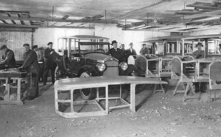 Här görs påbyggnader på Buicks som antagligen skall bli taxibilar. Karossverkstaden var inrymd på andra våningsplanet,