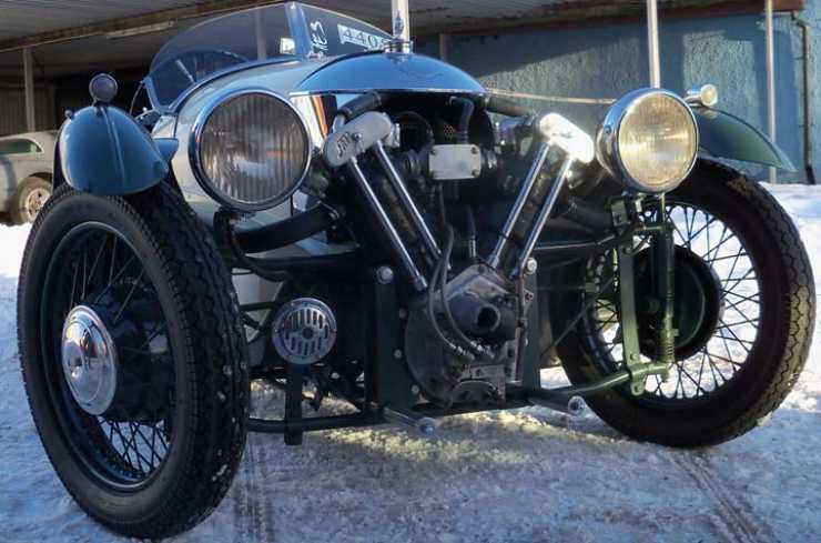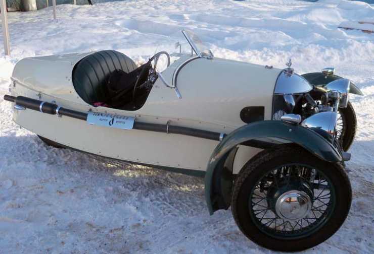 Detta är en Morgan Super Sports från 1933, en avancerad motorcykel eller en mycket liten bil, saken är den att Morgan höll fast länge vid trehjulingar för att de skulle kunna klassas som motorcyklar och därmed få lägre skatteklass och andra pålagor. Trehjulingarna från Morgan såg dagens ljus redan 1909 och fanns kvar ända fram till 1952, den första bilen med fyra hjul, 4/4, presenterades 1937.