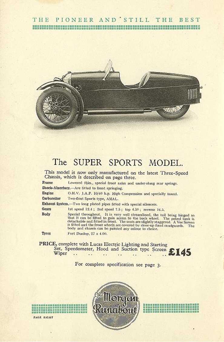 Trots att dessa Super Sports räknades som en bil, så kunde man som nämndes alltså registrera den som motorcykel, vilket höll priset väldigt fördelaktigt. Riktpriset låg på runt 150 pund, vilket var i ungefär samma klass som lilla folkbilen Austin Seven, så här fick man nog absolut mest prestanda för pengarna i trettiotalets England.