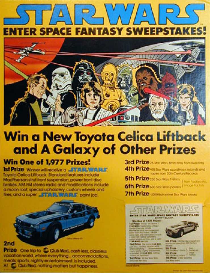 1977 var denna Toyota Celica högsta vinsten i "Space Fantasy Sweepstakes", en tävling för Star Wars fans, som 20th Century Fox låg bakom. Bilen byggdes av Delphi Auto design i Costa Mesa och modifierades med alla tidens knep, samt försågs med motivlack med star wars-tema. Någon Toyotahandlare i Kalifornien lär ha ställt bilen till förfogande, men vem är inte klarlagt, likså är det också okänt vem som kammade hem första vinsten när tävlingen var till ända vid årets slut.