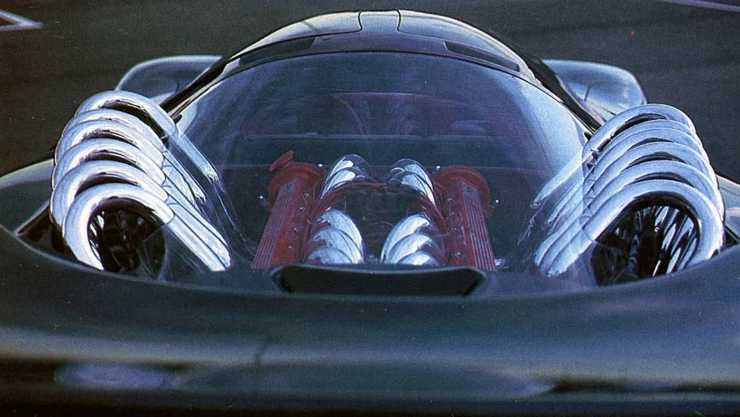 Och den schweiziske designern gjorde ingen besviken. På podiet stod Osmos - en blott meterhög skapelse, hela 210 centimeter bred och byggd runt en rödmålad Jaguar V12-motor som exponerades frikostigt genom en plexiglasbubbla.