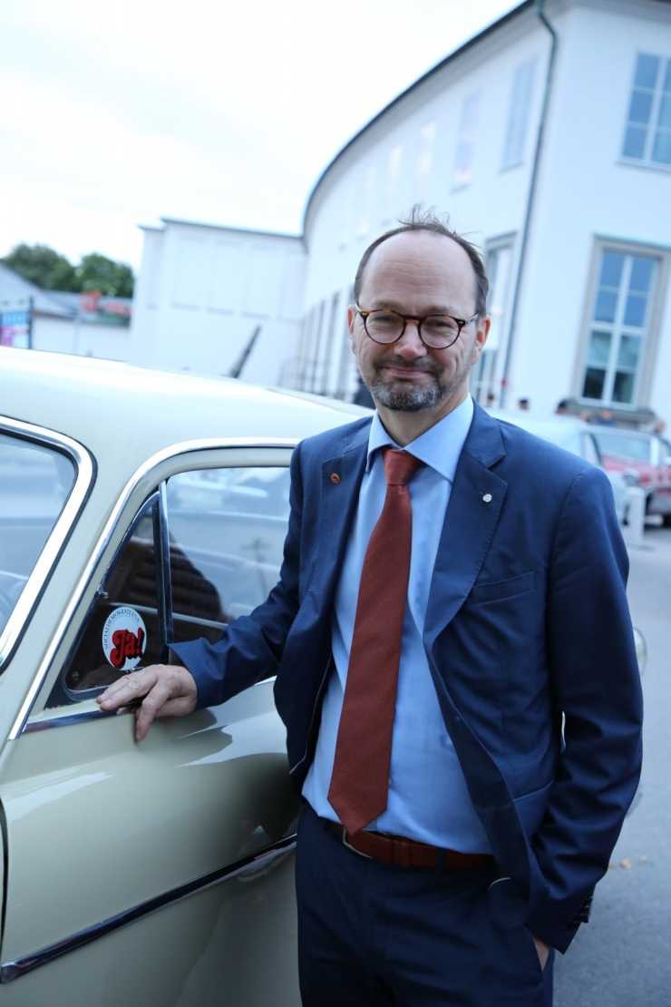Infrastrukturminister Tomas Eneroth vid 50-årsfirandet av högertrafikomläggningen. Då anade han inte hur mycket platina han var omgiven av.