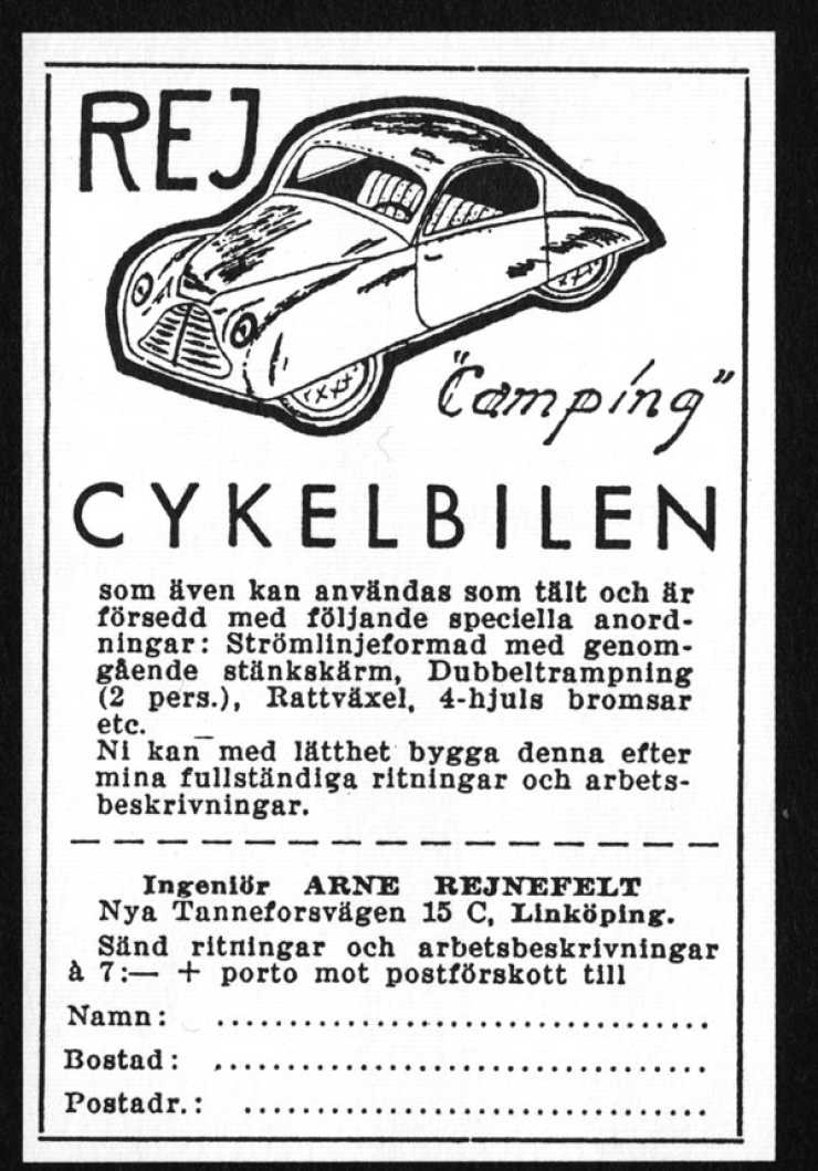 Arne Rejnefelt var även han ”ingeniör” och hans hembygge hade onekligen drag av den nya lilla Saaben som samtidigt växte fram i experimentverkstan. Fördelen med Rej Camping var dess mångsidighet. Den kunde med ”fördel användas som tält”.