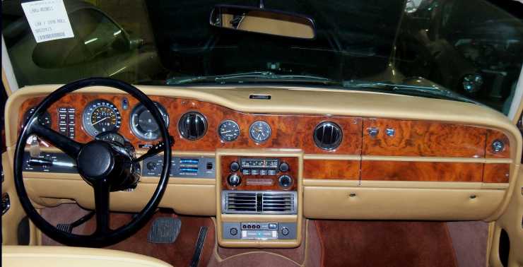 Kontoret i Silver Shadow, finaste lädret och de finaste träbitarna valdes omsorgsfullt ut. Ratten däremot är i bakelit, och den skall vara det. Rolls Royce var bland de första på 1910-talet att använda det nya materialet, och då var denna nyhet mycket exklusivare än trä.