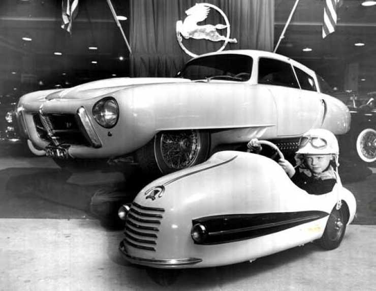 Vid sidan av den dyra Pegason provsitter grabben antagligen mässans billigaste bil, italienska Lucciola, som var en eldriven liten leksak för barn, fast som leksak betraktad var den ändå ganska dyr. 495 dollar fick pappa slanta upp för den här eleganta lilla kärran, ett pris man torde fått en bättre begagnad bil för.