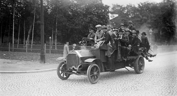 En bild från den tidiga bilismens ålder i Sverige. Enligt den lilla information som fins runt bilden är det anhängare till IK Göta som är på väg till det stora evenemanget Dagbladsstafetten i Stockholm. Denna stafett grundades 1913 och det är troligen detta år bilden är tagen. Lastbilen är en Scania från tiden 1911-13 av typen CLb.