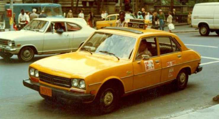 En gul Peugeot med usa-specifikation, dieselmotor, specialbyggd som taxi för trafik i New York 1975.
