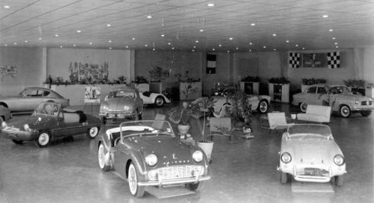 Men de var dock långt ifrån någon allmän företeelse. Här står ett gäng lite udda bilar ändå i en hall någonstans i USA. Triumph TR3A längst fram var ganska populär, de andra mer eller mindre kuriositeter. Bredvid står en liten Berkeley, i bakgrunden syns Borgward, Renault Dauphine, en exklusiv AC Aceca, en Morgan och en tysk microbil som heter Victoria Spatz.