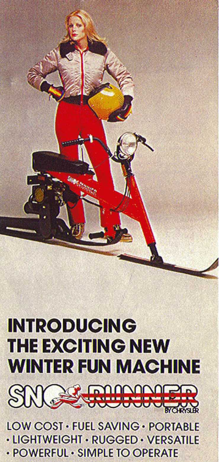 En egendomlig parentes i Chryslers fordonsutbud var den tuffa lilla Sno-runner som gjordes 1979-82. Det lär börjat som en idé för militärt bruk, men inget verkar verifierat om detta. Hursomhelst så är Sno-runner full av smarta lösningar. Hela cykeln, eller vad man ska kalla det kan plockas isär på under en halv minut med snabblås. motorn är en två-taktare på 135cc som gav runt 7 hästar i grundversion, det lär funnits sno-runenrs på 12-15 hk också. Hela prylen väger 35 kilo.