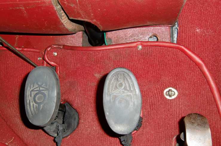 På min Flying Standard 1937 hade i alla fall flitigt trampande nästan helt utplånat pedalernas historiska symboler. Nytillverkning av pedalgummin till Standard av förkrigsmodell sker inte och vi var fem som bjöd på det oanvända paret på eBay.