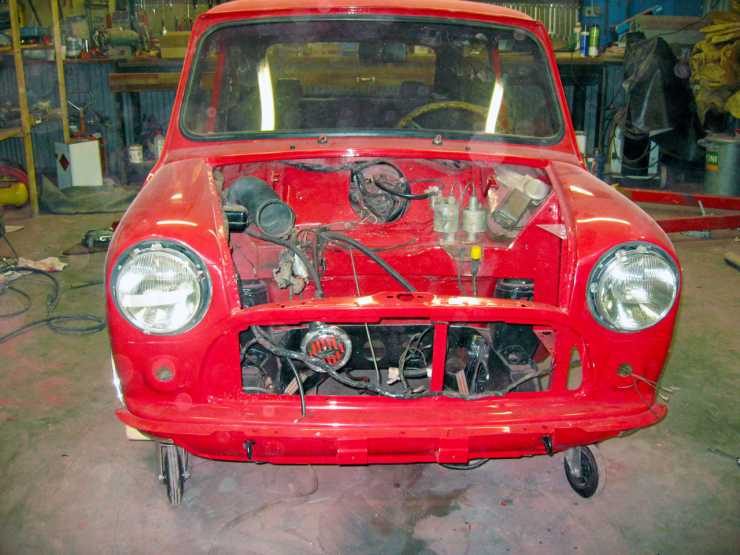 Eftersom den främre hjälpramen måste bytas då den visade sig vara fullständigt skev så åkte motorn ur. Minispecialisten Jana i Bålsta som gjorde jobbet kunde inte låta bli att samtidigt snygga till motorn lite och när nu den var ur så kunde inte heller Mikael Simlin som gör lackjobbet hålla fingrarna i styr så nu blev även hela motorutrymmet omlackerat.