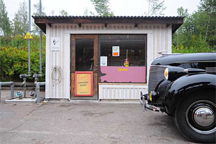 I Sågmyra finns en stor fabrik och en mycket liten mack. Vi stannade till med vår Chevrolet -39 på väg mot Siljans stränder.